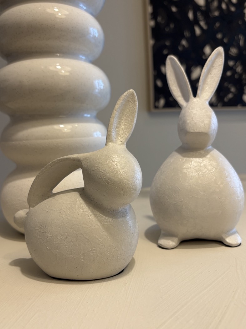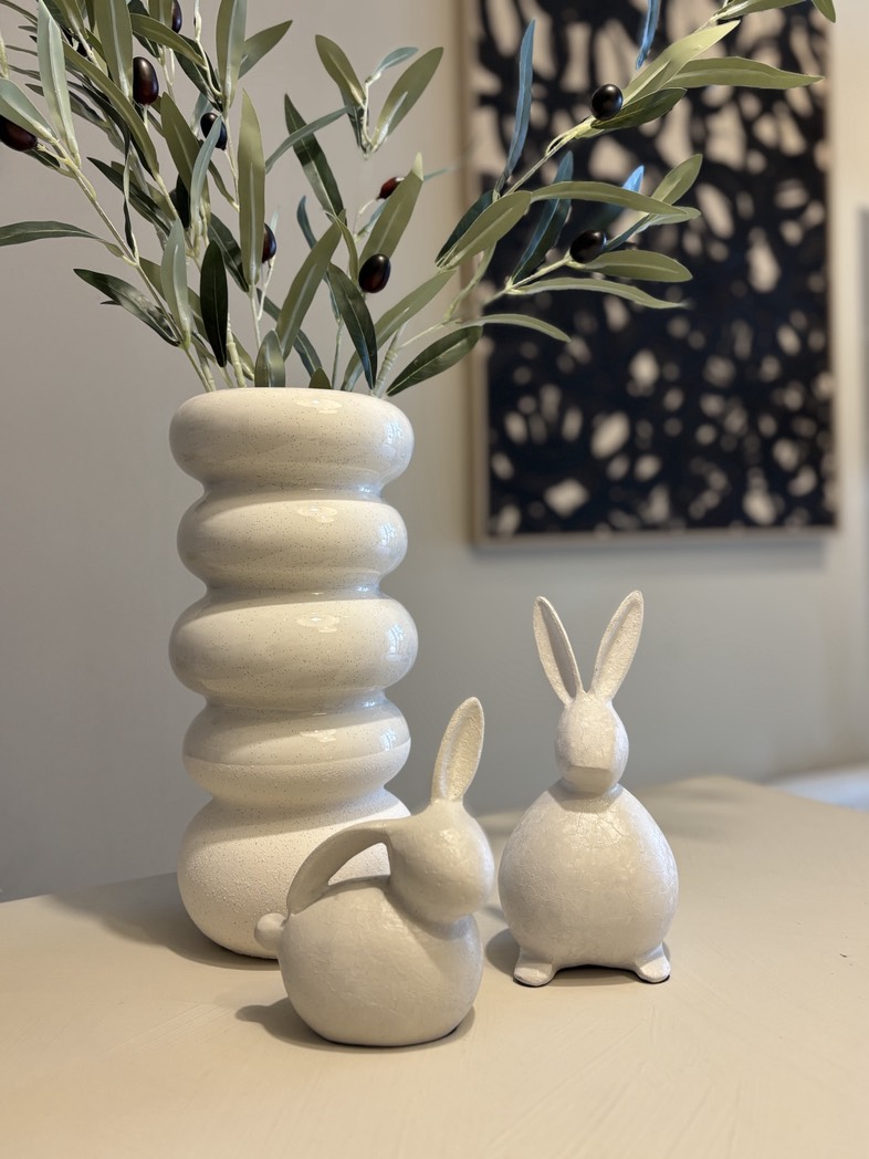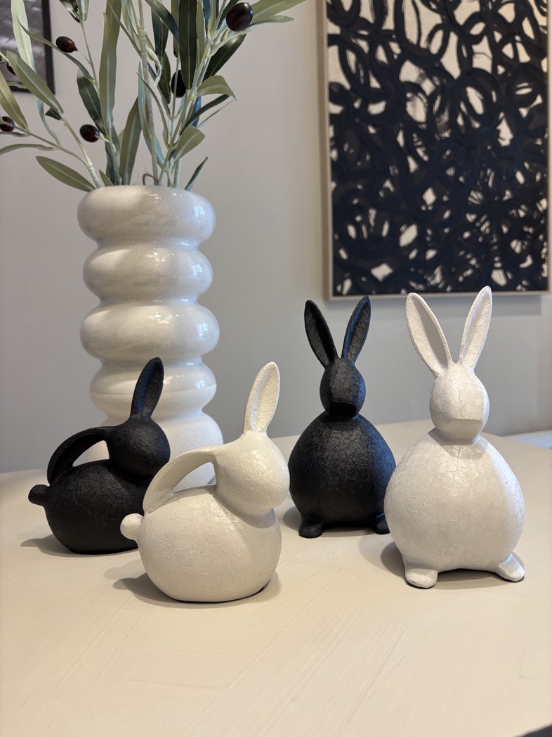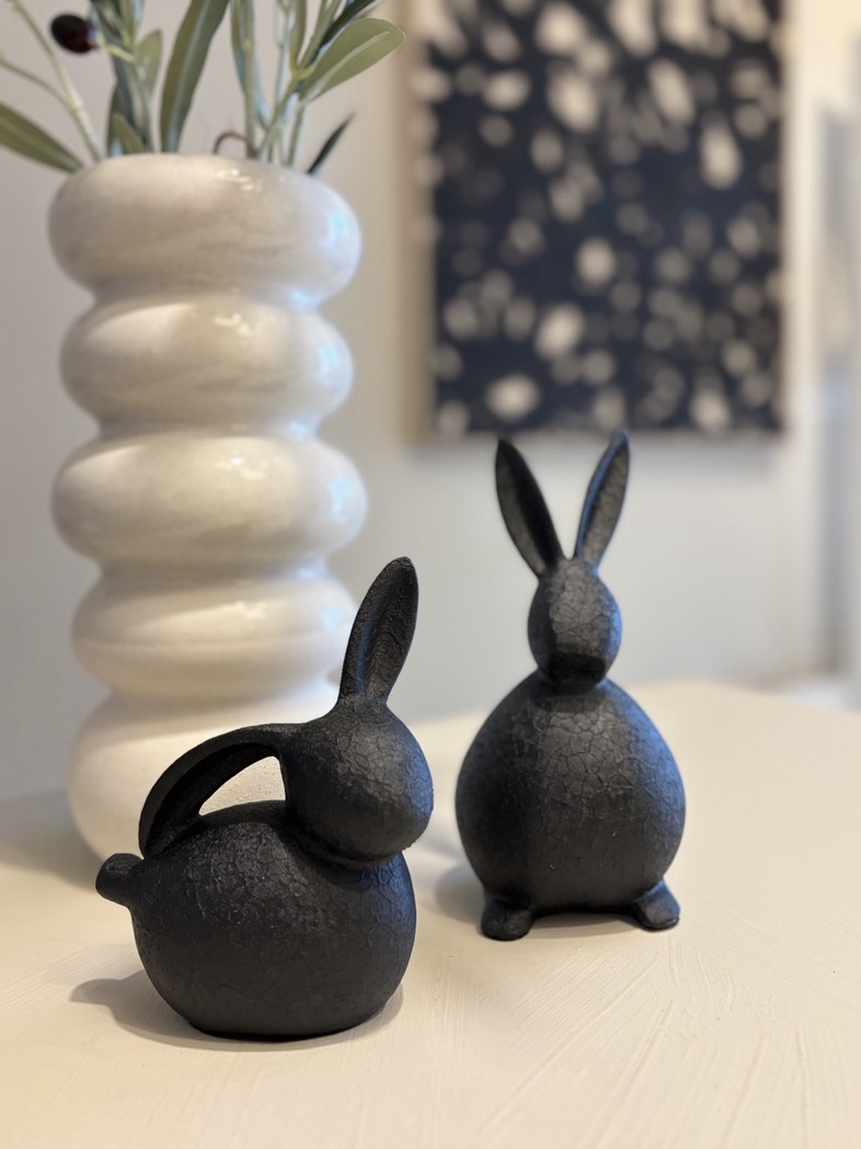 Voor een speels effect kun je het zittende en staande haasje met elkaar combineren. Ook het mixen van ivoor en zwart zorgt voor een interessant contrast. Zo geef je je paasdecoratie een eigentijdse twist die perfect aansluit bij Scandinavisch, Japandi of modern wonen.