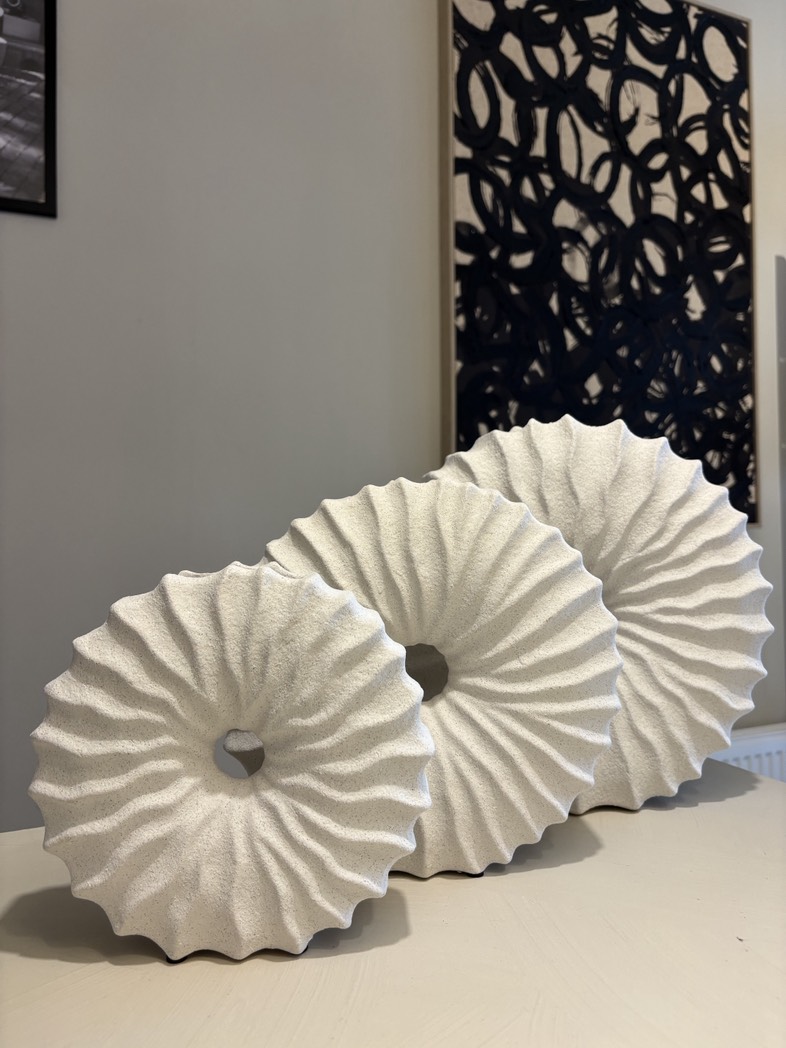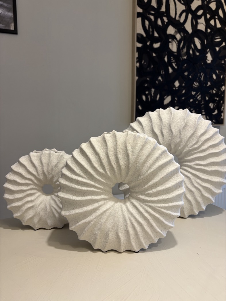 De matte off-white vaas is beschikbaar in drie formaten: S (20 cm), M (25 cm) en L (30 cm). Het kleine formaat is perfect voor een vensterbank of bijzettafel, het middelgrote formaat komt mooi tot zijn recht op een dressoir of salontafel, en het grootste formaat is een prachtig statement op een sidetable of open kast. Combineer meerdere formaten voor een speels en harmonieus effect.